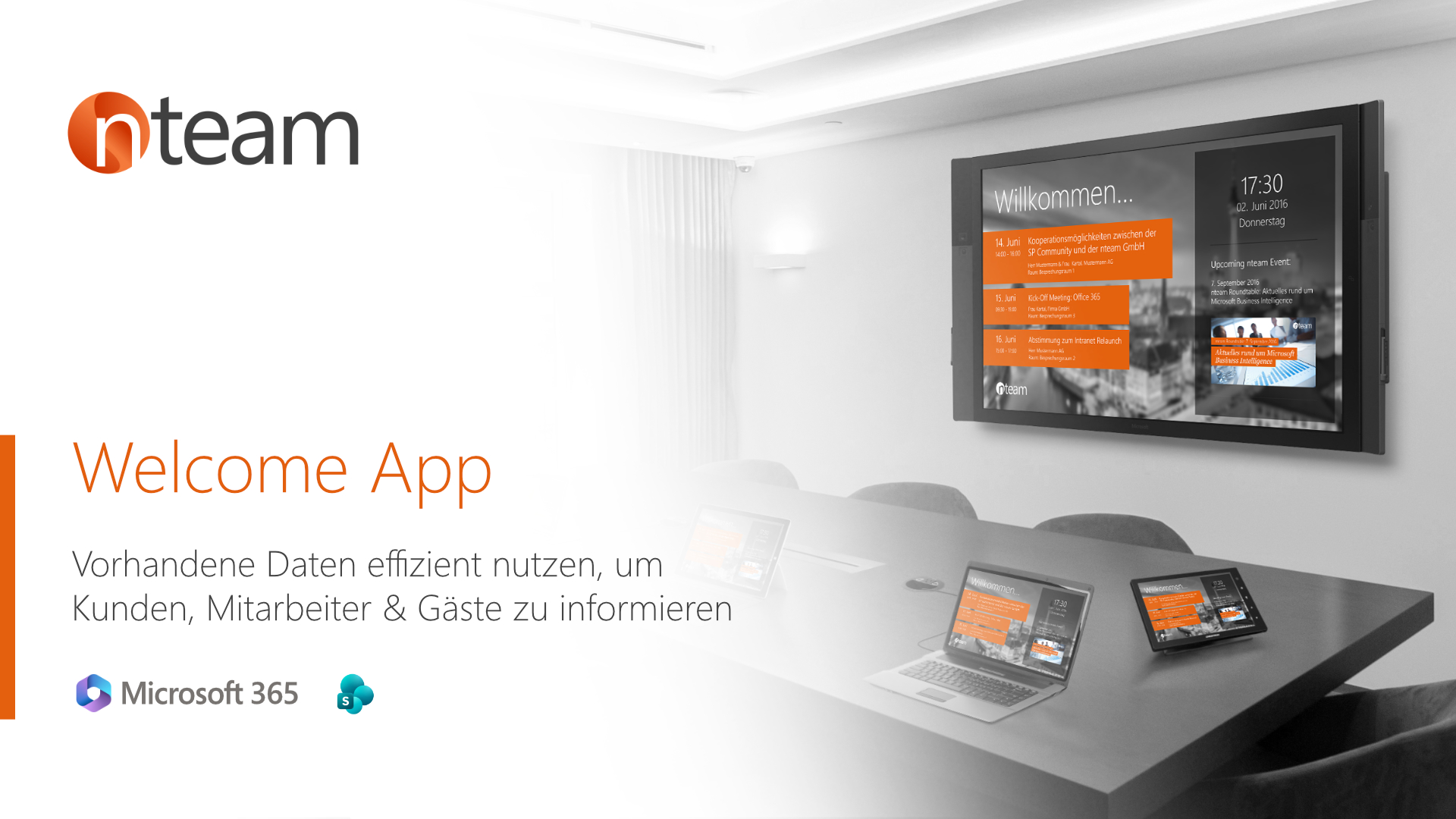 Als Universal App lässt sich die nteam Welcome App auf jedem beliebigen Bildschirm oder Tablet anzeigen. Die Daten für die "Welcome App" können beispielsweise aus Ihrem bereits bestehenden Intranet gezogen werden. Über eine gesonderte SharePoint- oder Office 365-Liste werden Termine, zugehörige Räume, Teilnehmer und z.B. anstehende Events angezeigt.