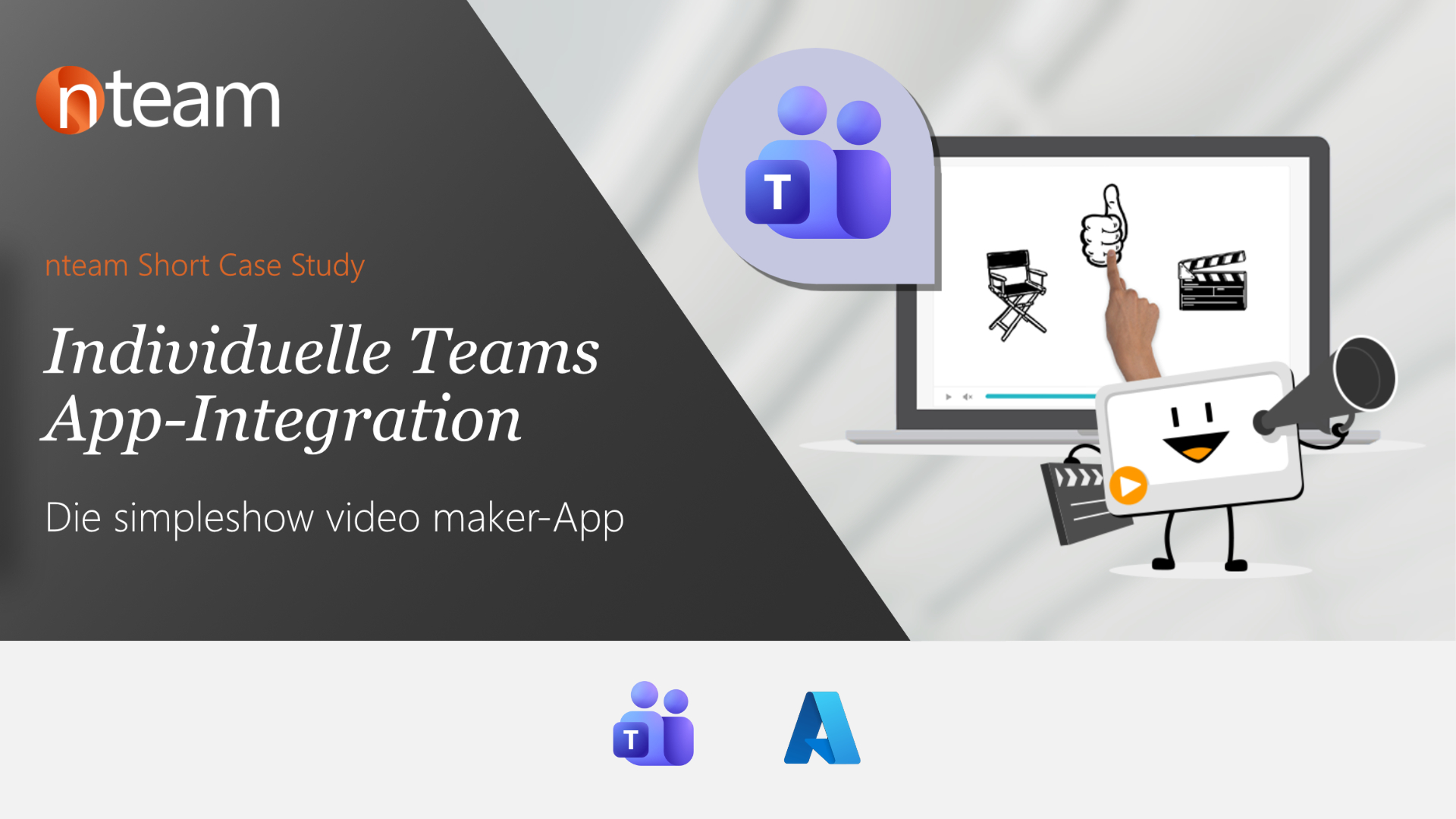 simpleshow hat es sich zur Aufgabe gemacht, die Welt jeden Tag ein kleines bisschen verständlicher zu machen. Die Erklärvideos helfen Kunden weltweit bei der Vermittlung komplexer Sachverhalte – und das in über 50 Sprachen! simpleshow hatte den Wunsch, die eigene Website sowie die Möglichkeit, Lernvideos zu erstellen, als eigene App in die Microsoft Teams App zu integrieren und für alle verfügbar zu machen. nteam entwickelt auf Grundlage dieser Anforderungen mithilfe des Microsoft Bot Framework 3 und Teams Studio die „simpleshow video maker“-App, die innerhalb von Teams intern über einen Tenant oder für jeden Teams-Nutzer über AppSource als zip-Datei publiziert werden kann. Die Kunden-App lässt sich einfach über den Teams App Store auffinden und hinzufügen und ist über einen Tab auf der linken Seite, direkt in der Teams App, erreichbar. Die Kundenwebsite kann ähnlich wie in einem Internetbrowser genutzt werden. Zudem hat man durch Messaging Extension die Möglichkeit, die App sowie Lernvideos innerhalb von Kanälen und im Chat direkt zu öffnen. Man kann also auf Postings antworten, im Chat direkt Videos der Lernseiten hinzufügen oder eigene Erklärvideos kreieren.